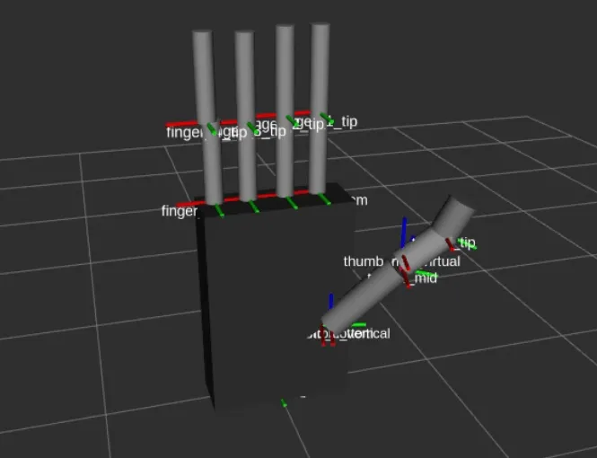 The d405 camera model is integrated into the URDF with the meshes for the visual tag and a box geometry is assumed for the collision to reduce the computation load. The gripper geometry is a combined model in STEP format and it is separated part by part in Fusion360 software to integrate the joints and movement of fingers and thumb for motion planning and grasping. In finger joints, joint rotation is mimicked for the fingertip if the finger base is rotated. The thumb can rotate on two axes, in one rotation, there are three joints mimicking the motion of the thumb base and for the other joint rotation, the whole thumb rotates.