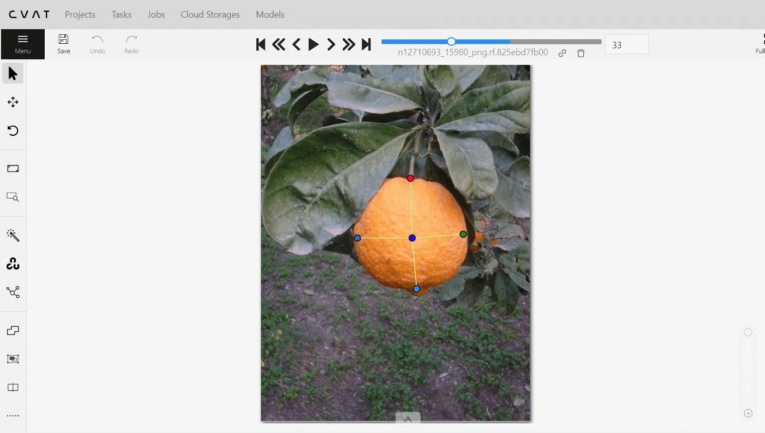 Fruit Selection: One of the limiting factors in the model is single-class detection at a time, thus, a selection of fruit has to be made to proceed further and the orange fruit has been selected as the target fruit for the use case. A combination of public datasets along with the images captured by the camera has been selected for setting up the model for training. Some of the infested oranges are also considered for better training of the model. As the model is not originally intended for fruits, manual data annotation must be performed in either COCO keypoint or YOLO pose format. CVAT.ai [Ref.] is an open-source platform for data annotation and it offers multiple data format export options and the annotation format of COCO key points 1.0 format can be exported, which is converted to YOLO pose format before training [Ref.]. The following public datasets are used for preparing training and validation datasets: