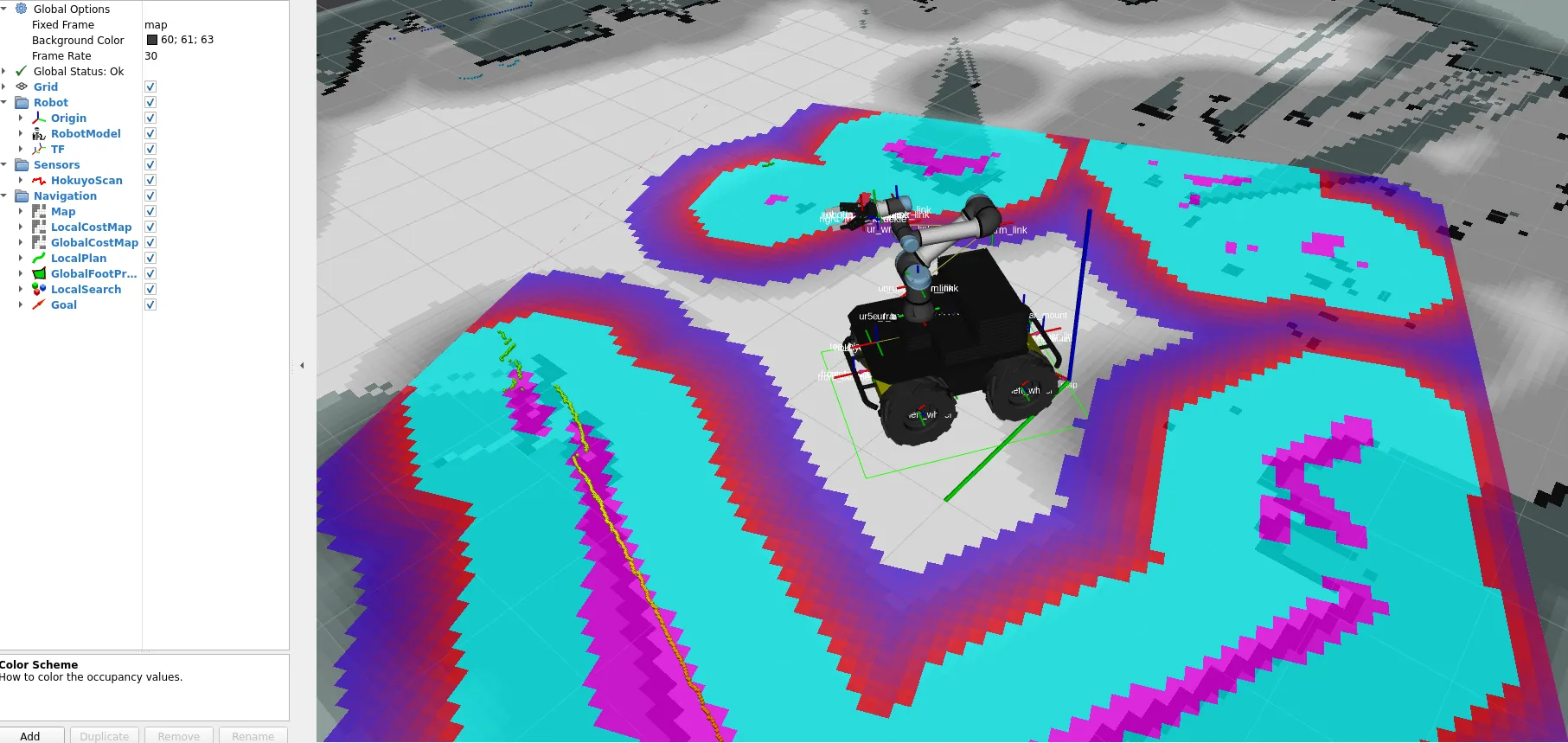 Odom Based Navigation: After launching the drivers and commands, providing a 2D navigation goal in RViz initiates the navigation process. The brown arrow indicates the 2D navigation goal, while the small orange line represents the global planner and the green arrows depict the local planner. The green box surrounding the robot signifies the bounding box. In the map, blue areas represent the local cost map, and the grey area corresponds to the global cost map