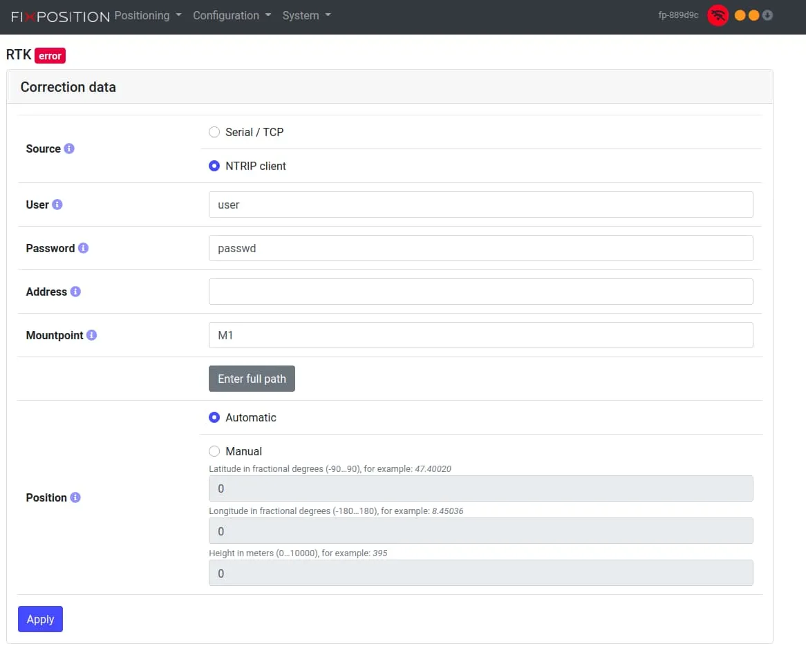 The next step is to connect the Fixposition to a local base station for GPS correction. This can be done either by another GPS or by connecting the Fixposition to the internet and providing it an NTRIP.