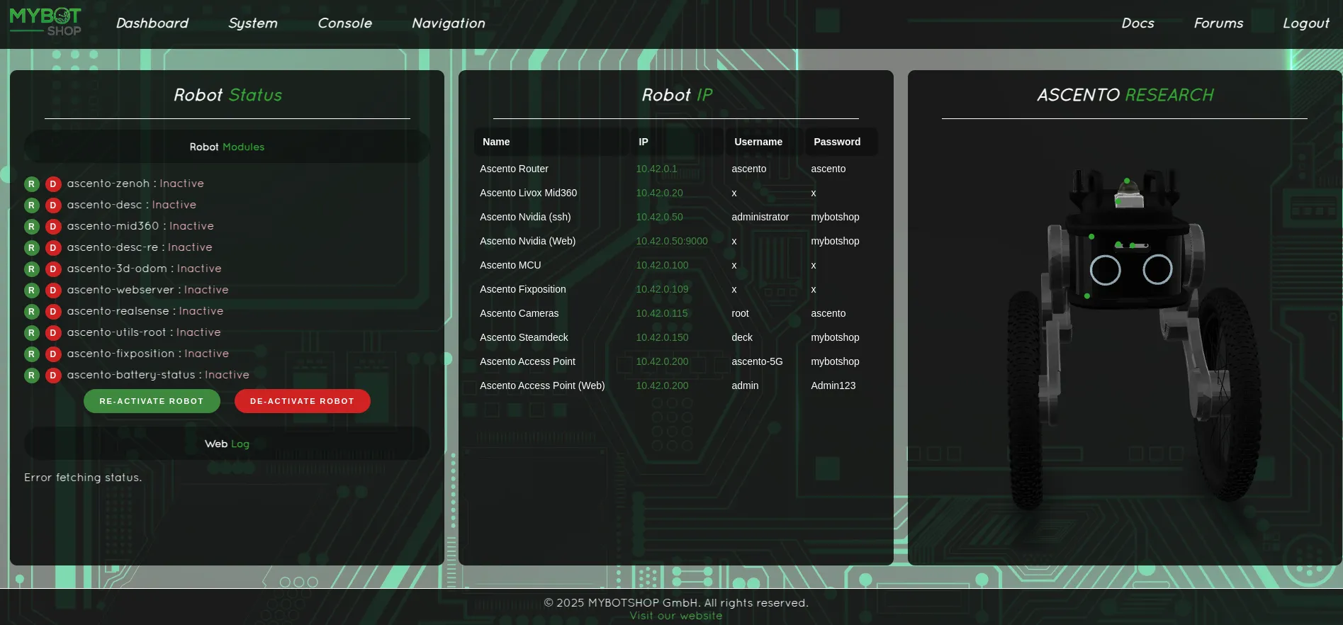The table below provides a reference for the IP addresses and login credentials for various Ascento components: