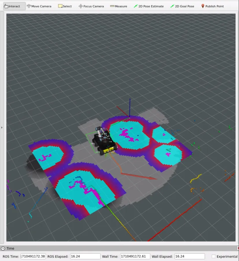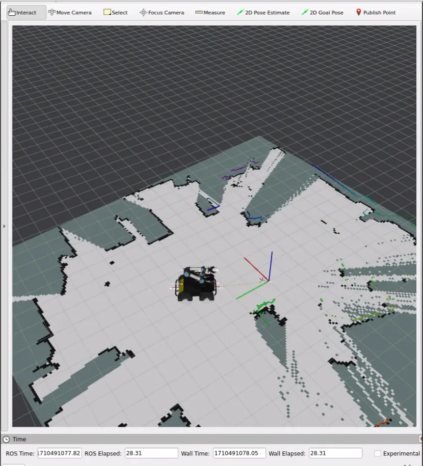 Odom Based Navigation: After launching the drivers and commands, providing a 2D navigation goal in RViz initiates the navigation process. The brown arrow indicates the 2D navigation goal, while the small orange line represents the global planner and the green arrows depict the local planner. The green box surrounding the robot signifies the bounding box. In the map, blue areas represent the local cost map, and the grey area corresponds to the global cost map